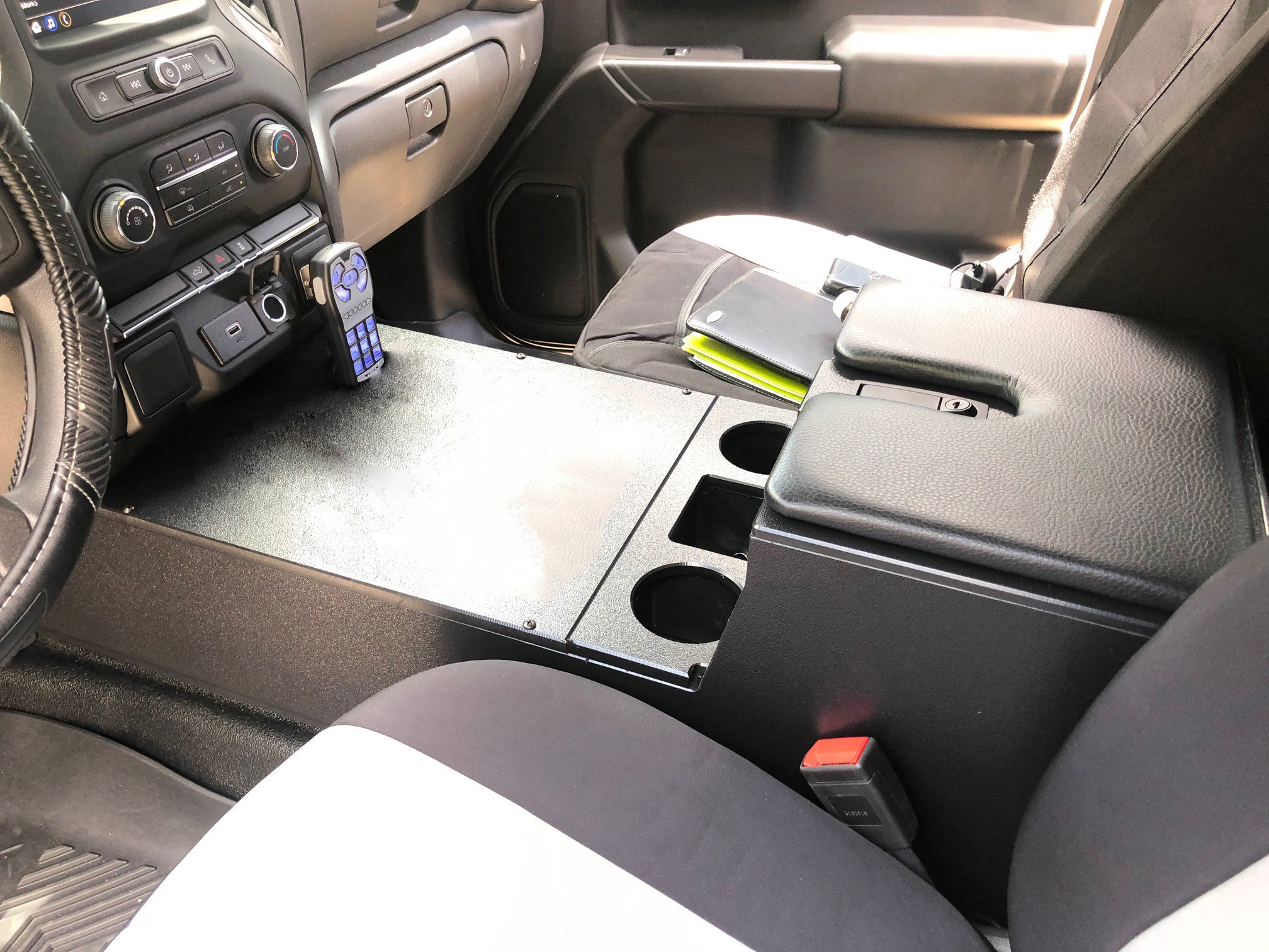 These consoles come with all of our standard features, including the large radio/siren faceplate mounting area, cup holders, storage area, padded arm rest, and driver side access panel. Installation brackets and hardware are also included. The brackets use factory center seat mounting holes, so installation is a breeze.